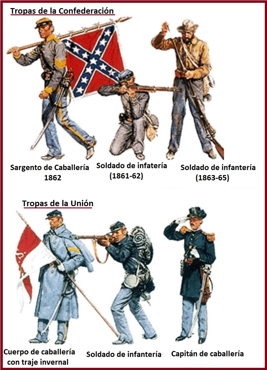 El conflicto se desarrolló en dos escenarios: por un lado, la costa este, donde estaba la capital de la Unión, Washington, y la de la Confederación, Richmond; por otro lado, al oeste de los Apalaches, en la cuenca de los ríos Mississippi y Ohio. En los dos primeros años, la iniciativa fue de los ejércitos sureños, que obtuvieron algunas victorias significativas (Bull Run, Seven Days o Chancellorville entre otras), pero posteriormente el Norte supo dar un vuelco a la situación y pasó a la ofensiva. Pronto el Sur sufrió un duro bloqueo marítimo que mermó sus posibilidades, mientras los generales del Norte, Sheridan, Sherman y Grant se iban imponiendo gracias a la superioridad material de sus ejércitos. En frente, el general sureño Lee, un militar con gran capacidad estratégica, pero que contaba con un ejército menor y peor preparado.